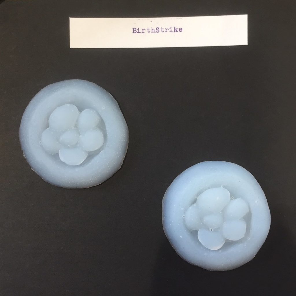 Robin Danely’s luminous parent and child portraits brought deep tenderness into the room, a counter to Rowan Ryrie’s flashing crisp packet cut-outs of blue fin tuna, alerting us to the notion that by 2050 the oceans could be more full of plastic than fish. Josephine Rutherfoord created ‘Blastocyst & Birthstrike’ – itself a conversation between her silicon model of a flower-like embryo 5 days after fertilization and news of a current movement where women are choosing not to have children until politicians address the climate emergency.  Above that hangs my poem, Peaking, written during a time of choosing to conceive a child in a time of peak oil 14 years ago.
